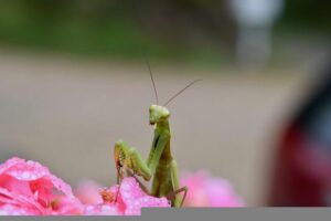 La mantis religiosa espera pacientemente a su presa. (The praying mantis patiently waits for its prey.)