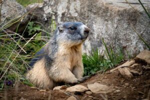 La marmota se asoma fuera de su madriguera. (The marmot peeks out of its burrow.)