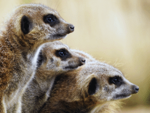 - (The family of meerkats was sunbathing in front of their burrow.)